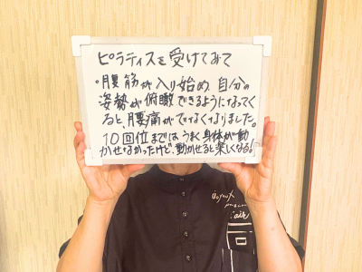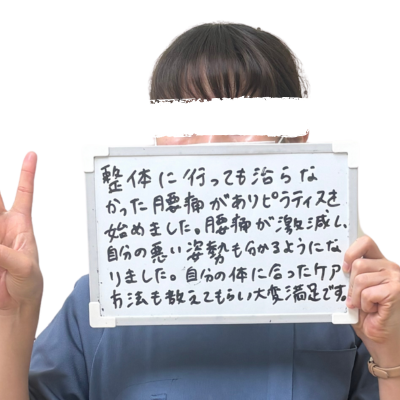 整体に行っても治らなかった腰痛がありピラティスを始めました。腰痛が激減し、自分の悪い姿勢もわかるようになりました。自分の体に合ったケア方法も教えてもらい大変満足です。