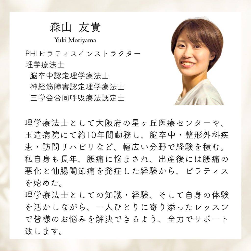 国家資格である理学療法士免許とピラティスインストラクターの両方の免許を兼ね備えているインストラクターが対応します。総合病院で約10年の勤務経験を活かし、医学的な視点とピラティスのメソッドを融合。お一人おひとりのお悩みや目標に合わせた、オーダーメイドのプログラムをご提案します。