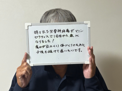 時々出る坐骨神経痛が、マシンピラティスで1回目から楽になりました!痛みが出にくい体づくりのために、今後も続けて通いたいです。