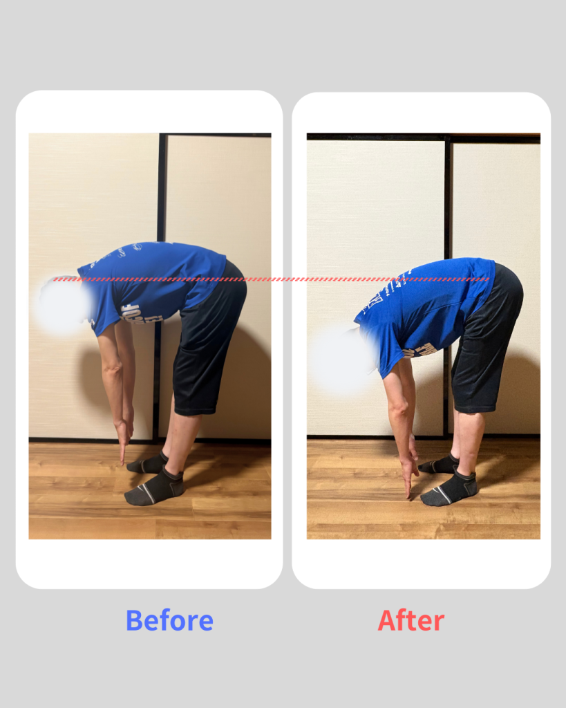 初回体験時は前屈動作が硬く、腰まわりの動きに制限がある状態でした。